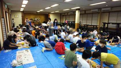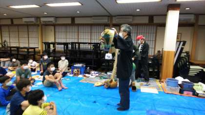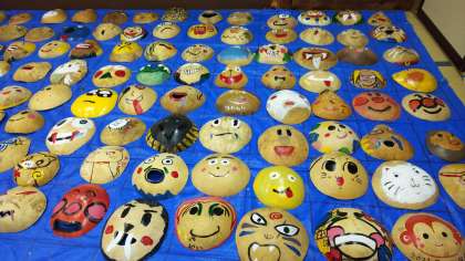 おいしい夕食の後は伝統工芸のふくべ細工を楽しみました。出来上がったお面にニスを塗っていただいてから学校に送られてきます。2学期の6年教室に飾ります。