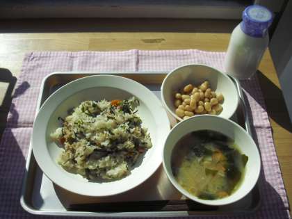今日の献立は、磯おこわ、みそ汁、ぶどう豆、牛乳です。
