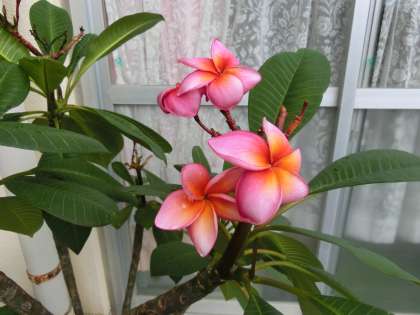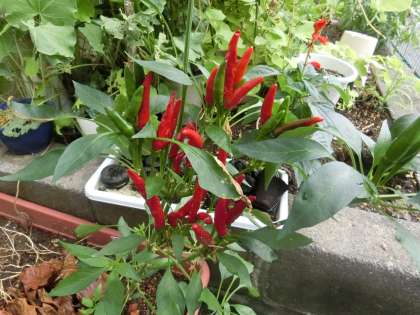 保健室前の花壇は、プルメリアや唐辛子など植物たちでにぎわっています。