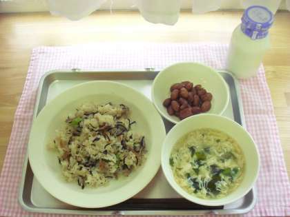 今日の献立は、ひじきごはん、かきたま汁、金時豆の煮豆、牛乳です。
