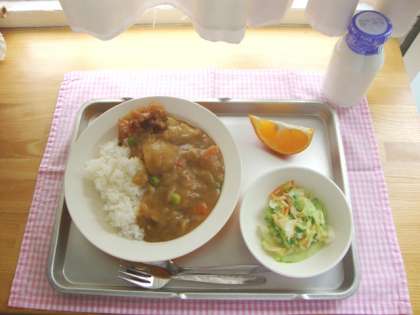 今日の献立は、カレーライス、キャベツサラダ、天草オレンジ、牛乳