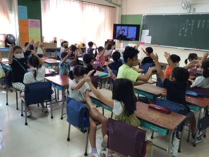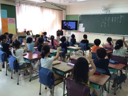 今日の音楽朝会は手遊び歌「十五夜さんのおもちつき」を楽しみました。友達と対面するので、「歌わない」「手をさわらない」でわらべ歌を楽しみました。