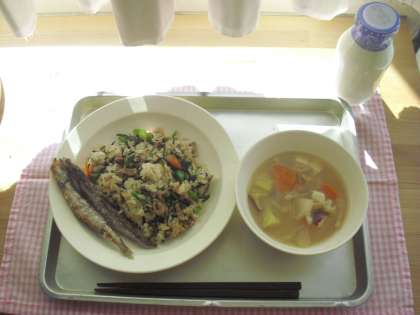今日の献立は、磯おこわ、ししゃもから揚げ、さつま汁、牛乳です。