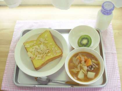 今日の献立は、はちみつレモンバタートースト、ボルシチ、