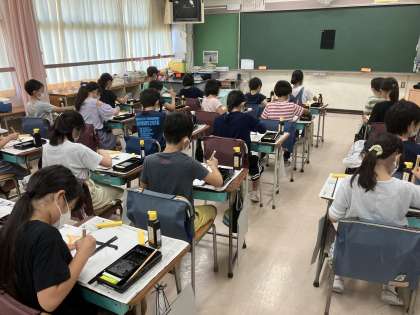 筆の入れる向きや払い方、力の入れ加減もポイントです。教室には、子どもたちの個性が光る素敵な作品が掲示してあります。来校した際にはぜひご覧ください。