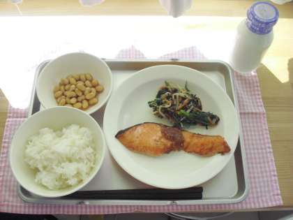 今日の献立は、ごはん、さけのごま味噌焼き、ほうれん草のりあえ、