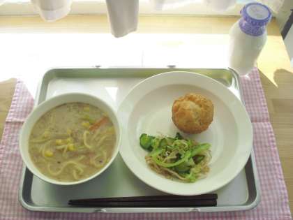 今日の献立は、中丸ラーメン、野菜の中華風味、開口笑、牛乳です。