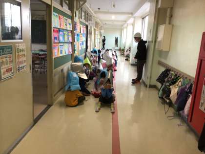 小雨が降っていたので、10月の避難訓練は廊下までの避難にしました。理科室からの出火という想定で行いました。火災で恐ろしいのは煙を吸い込むこと。口を覆いながら低い姿勢で避難することを学びます。