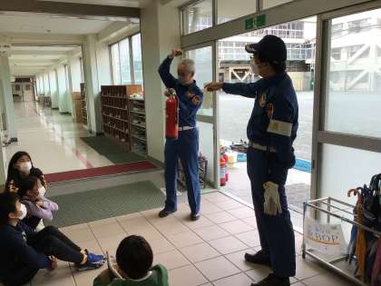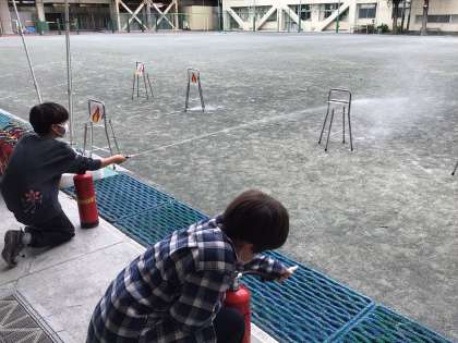 6年生は消火器訓練も行いました。まずは身の回りの人に火災の発生を大きな声で知らせます。天井まで届くような大きな火災や複数の出火には消火器では対応できません。初期消火対応と火災を起こさないような日頃の環境づくりの大切さを学びました。