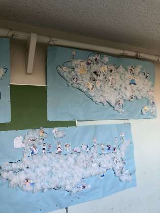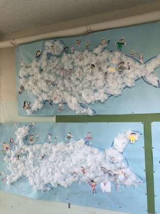 お話の世界を想像して、自分たちがくものくじらに乗って遊んでいる様子を描きました。1組と2組の間の廊下に掲示してあります。