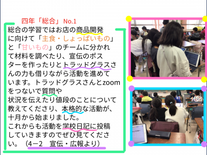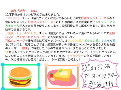 2組では、総合的な学習の時間で、広報・宣伝係がお店とのコラボ商品開発についての記事を書きました。今後の経過も楽しみにしていてください。