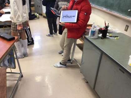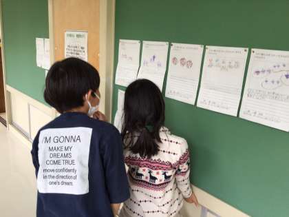 2年生教室前では、友だちが作ったかけ算の問題に取り組んでいました。学んだことを活用した問題が作られていました。