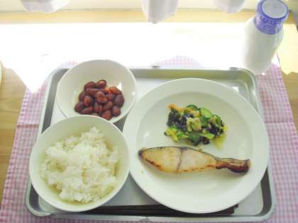 今日の献立は、ごはん、さわらの西京焼き、和風サラダ、金時豆の煮豆、
