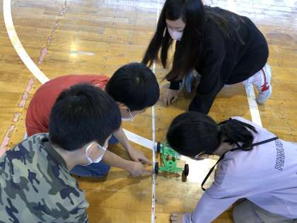 理科の学習では、風のはたらきを学習しました。そして、次は、ゴムのはたらきについて学習しています。ゴムを使って車を走らせます。どのようにしたら車を遠くまで走らせることができるのかを考えて実験です。子どもたちからは、「ゴムの数を増やす」、「ゴムの太さを太くする」「ゴムの伸ばす長さを長くする」という考えが出ました。グループで協力しながら実験することができました。