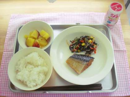 今日の献立は、ごはん、さばのみそ煮、大根とひじきのサラダ、