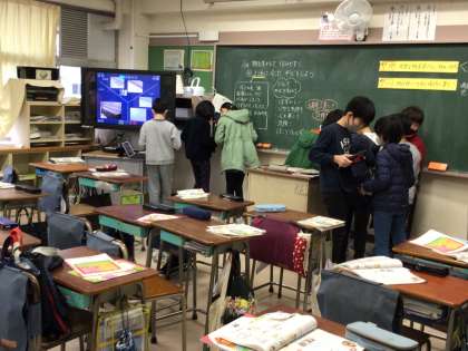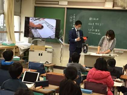 2年生の教室では、図工の授業で紙版画のお手本を先生が見せてくれました。手元の操作もテレビに映しとても分かりやすかったです。