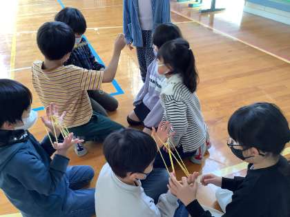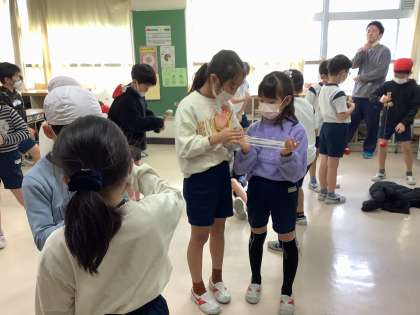 来週の火曜日に1年生との昔あそび交流会があります。生活科の時間には、1年生に楽しんでもらえるよう、どの子も張り切って練習をしています。今日は、1年生役と2年生役に分かれて説明の練習をしました。説明に合わせて技を実演したり、優しく寄り添って声を掛けたりして、教わる側の立場に立って遊び方を教えることができました。