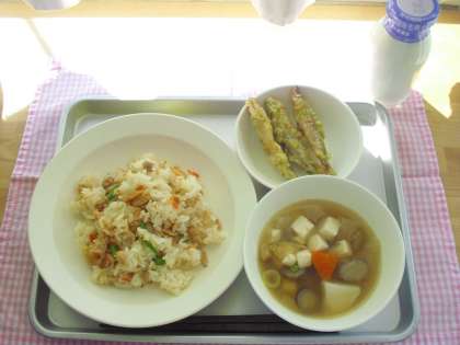 今日の献立は、子ぎつねごはん、けんちん汁、わかさぎの磯辺揚げ、