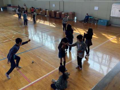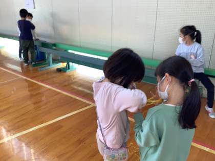 2年生のお兄さんお姉さんに遊び方やコツを教えてもらい、楽しく昔遊びに取り組むことができました。