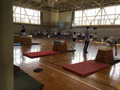 中丸ホールでは跳び箱を使った学習を4年生が行っています。身体能力、基礎体力等が年々低下しているといわれています。体育の時間や休み時間には少しでも体を動かす経験をさせています。
