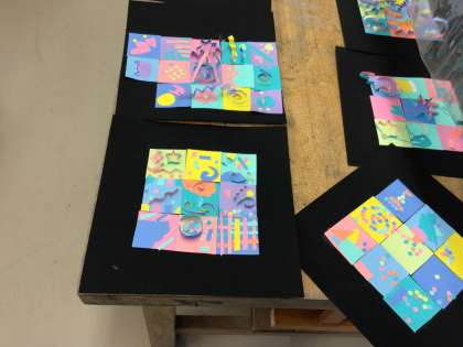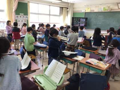 今日は1年生がとてもよい姿勢で鍵盤ハーモニカを吹いていました。入学式で披露してくれるかもしれません。図書室前には子どもたちがつくったオリジナルの本が展示されています。図工室では3年生がいろいろな技法を使って半立体作品を仕上げていました。