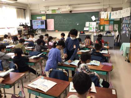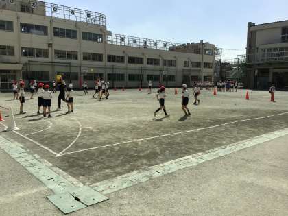 3年生が校庭でハンドボール、1年生は算数の形の学習を行っていました。