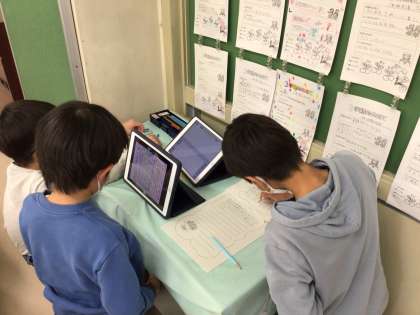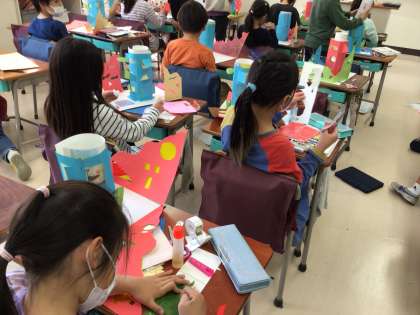 2年生は図工と国語の学習に取り組んでいました。カッターを正確に使って細かい模様、ドア、窓などを切り抜いていました。タワーの中の画用紙を回すと風景が変わる工夫された教材です。どの作品も自慢したくなるものばかりです。国語では、先日の保護者の方からいただいたお手紙のお返事を書いていました。楽しみにしていてください。