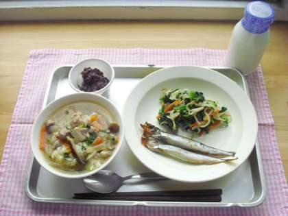 今日の献立は、五穀雑炊、焼きししゃも、ほうれん草のおひたし、