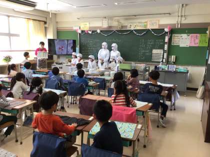 1年生も今日から給食です。当番さんはすばやく身支度を整えています。当番以外の子どもはランチョンマットを用意して静かに待てています。小1サポーターさんへの申し込みもいただきうれしい限りです。本当にありがとうございます。今日は特別に調理員さんにお手伝いに来てもらえたクラスもありました。これからも中丸小のおいしい給食を楽しみにしてほしいです。