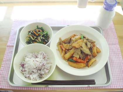 今日の献立は、ゆかりごはん、きんぴら煮、ほうれん草のりあえ、