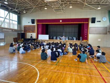 担任の自己紹介や学年便りの表題の意味、ほかの学年の手本になることを話しました。