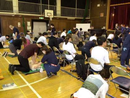 響きの学び舎の駒繋小学校・旭小学校・中丸小学校の先生方が、駒繋小学校体育館で救急救命講習を、東京防災救急協会、世田谷消防団の皆様から受けました。