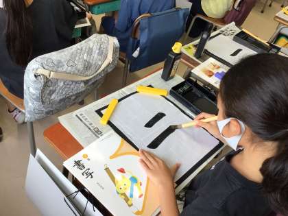 3年生が最初の書写の学習に取り組んでいました。日ごろ使わない筆を使ってのびのびと表現しています。「スー トン トン」と書写の時間の約束を確認しながら、姿勢を伸ばし筆を立てている姿が凛々しいです。