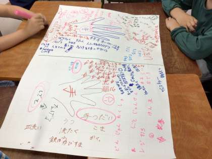 ワークショップの時には、自分とは違う考えや意見でも否定せず最後まで聞くこと、つらくなったら先生に伝えて保健室で休んでいいことをファシリティターの方と約束し、感情をモニタリングするワーク、人権について学ぶワークショップを行いました。2時間目以降は、各教室ごとでワークショップを行います。