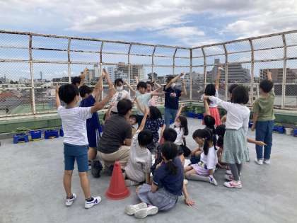 理科の時間に屋上で、太陽とかげの学習をしました。遮光板や方位磁針を使って、太陽とかげの1日の動きを調べました。記録を録ったことで、太陽の動きとかげの動きの関係に気付くことができました。また、太陽が東から上って西へ沈むということを学んだことで、中丸小学校の「あさひの広場」と「ゆうやけ広場」の名前の由来についても気付くことができました。