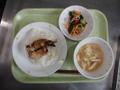 <本日の献立> 魚のかば焼き丼 和風サラダ 味噌汁