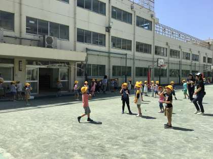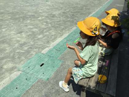 1年生が朝のうちに短時間で、生活科の学習「シャボン玉遊び」を楽しんでいました。