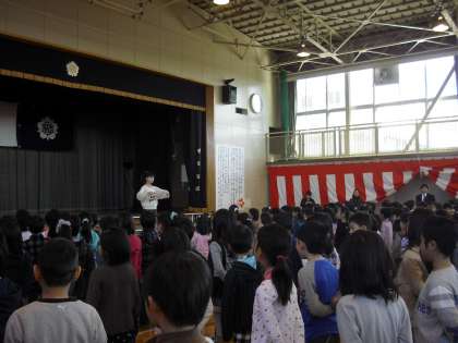まずは、8時25分から体育館で音楽朝会を行いました。