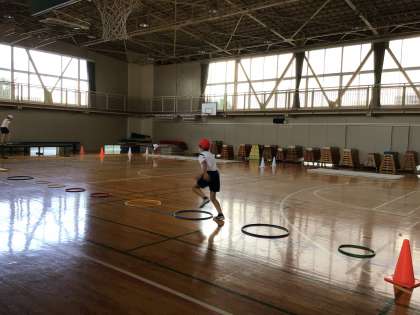 その中で、4年生が幅跳びと高跳びの練習に取り組んでいました。中丸ホールでは、幅跳びにつながる動きのほかに平均台歩き、マット運動と多様な動きを行っていました。狭い校庭や中丸ホールの中でも、子どもたちの運動量を上げるためにどの学年も工夫しています。