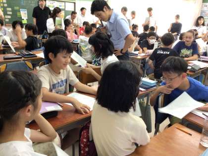 自分なりに集中して読み込んだ後、グループで考えを交流し合います。その後クラス全体で交流しました。自分とは全く違う視点の考えの友だちの意見を聞く中で、「なるほど」「思いつかなかった」と考えをさらに深めていきました。教材のよさもさることながら、中丸の子どもたちのやさしさ、考えの深さが活発に話し合う姿から見られ、講師の先生からもたくさんおほめの言葉をいただきました。