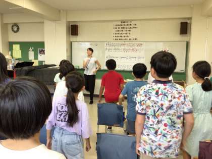 4年生は、旋律の重なりのよさを感じながら歌う学習内容でした。歌Aパート、歌Bパート、聞くパートに分かれ交代しながら、歌を聞きあいます。「出だしをそろえよう」「8分休符のところは伸ばさないで、ちゃんと休む」など聞きあう中で課題を見つけ解決していきました。「Aだけで歌ってもよかったけど、重なると楽しい。」と心地よさを味わうことができました。