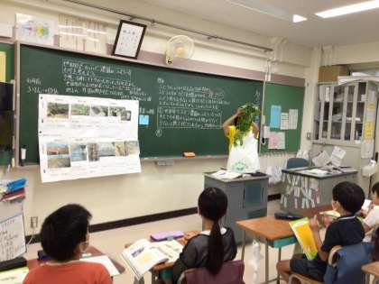 2時間目も3年生でしたが、区内のぶどう農家の工夫について学んでいました。「40年前は3件だったぶどう農家の数が10件に増えた理由」について、じゃがいもが収穫されるまでとぶどうが収穫されるまでの育て方の違いの資料から読み取り考えます。「えっ!」「そんなはずはないよ!」と予想を見事に裏切るような資料提示に子どもたちは前のめりになって取り組んでいました。「世田谷区のぶどう農園に行ってみたい。」と言い出すかもしれませんが、ご協力していただけるとありがたいです。