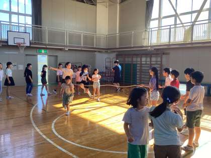 今週の体育朝会は、長縄に取り組みました。八の字跳びで3分間に何回跳べるか挑戦しました。記録を伸ばせるように、友達同士でコツを教え合ったり、励まし合ったりする姿がたくさん見られて嬉しく思いました。