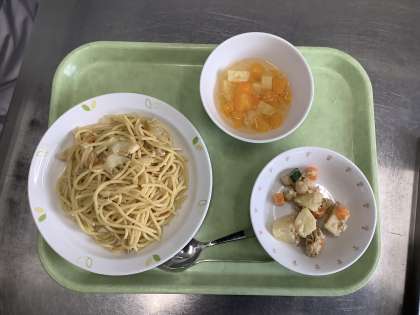 <本日の献立> 和風スパゲティ ビーンズサラダ フルーツポンチ