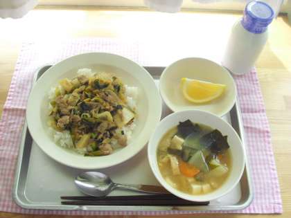 今日の献立は、キムチ丼、みそ汁、河内晩柑、牛乳です。