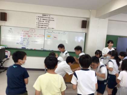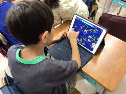 1年生は、ロイロノートに入っているシンキングツールを使い、箱の形の仲間分けに挑戦していました。仲間分けを行うのに最適なシンキングツールを子どもたちが選び、平面や曲面の特徴に気付いて仲間分けをしていました。