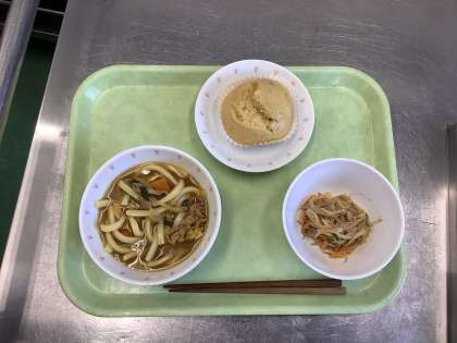 <本日の献立> カレーうどん もやしのごま和え 黒砂糖蒸しパン