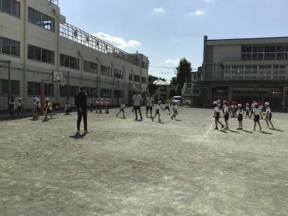 2年生はクラスごとに、タグを使ってミニゲームをしました。いつもと違う先生に子どもたちも興奮気味です。