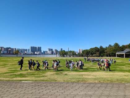 潮風公園で昼食を食べます。素晴らしいお天気の下でおいしいお弁当をいただきます。朝からの準備、ありがとうございました。