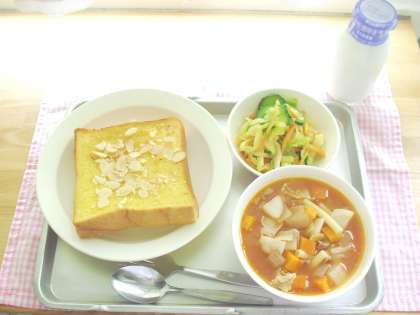 今日の献立は、はちみつレモンバタートースト、ミネストローネ、